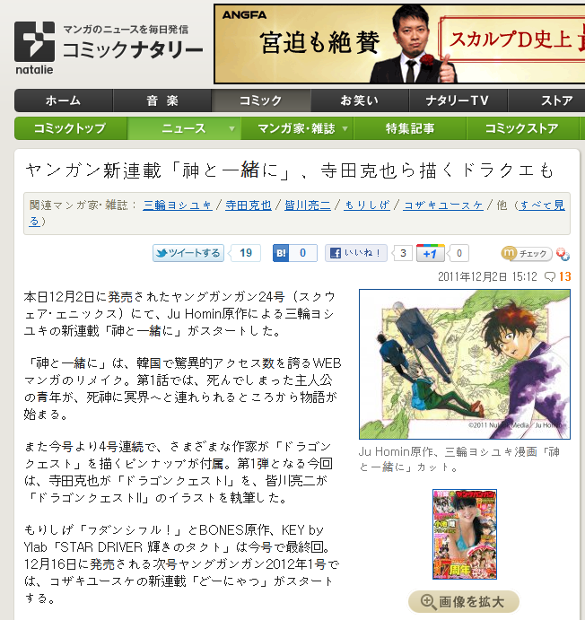 일본 웹진 '코믹 나탈리이' 에서 주호민 원작의 네이버 웹툰 「신과 함께」 가 미와 요시유키 작화로 스퀘어에닉스 망가 잡지 '영간간' 24호를 통해서 연재를 개시했다는 소식을 전했습니다. 이미 어제 부로 주호민씨의 블로그와 스퀘어에닉스 편집부에서 일하는 한국인분의 블로그를 통해서 소식이 전해졌고, 영간간에 실린 연재분도 공개 됐습니다.