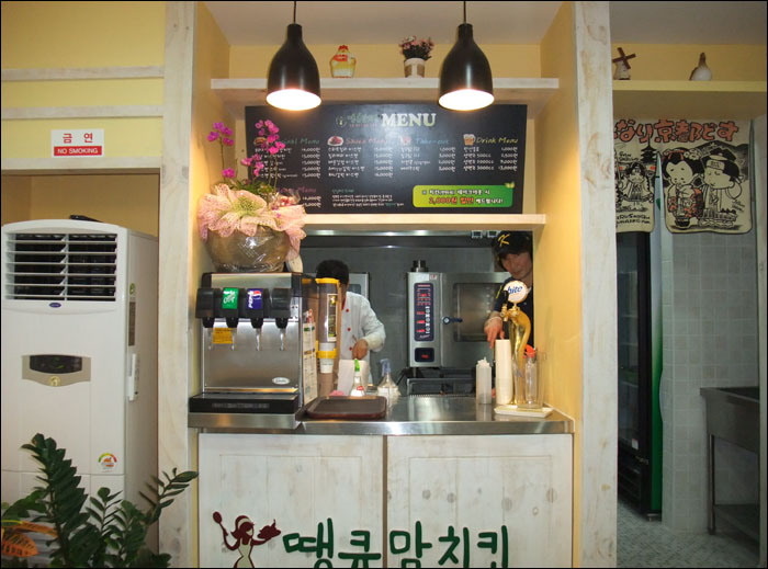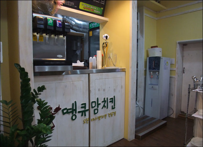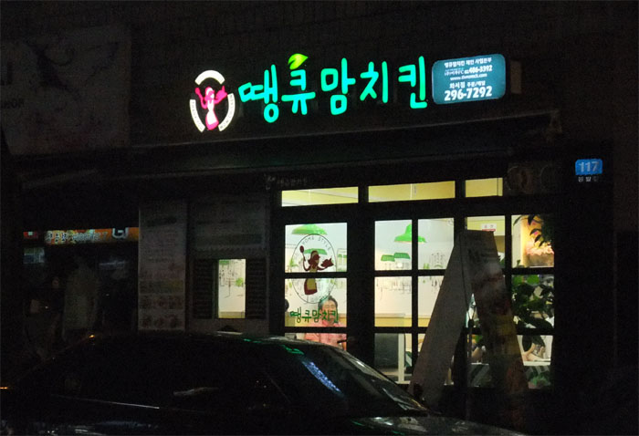 야심한 밤에 찍은 사진이라.. 땡큐맘 치킨이라는 단어만 아주 잘나왔네요.. 실제 문은 초록빛 나무로 이루어져 아주 깔끔한 느낌을 주는 가게였답니다~