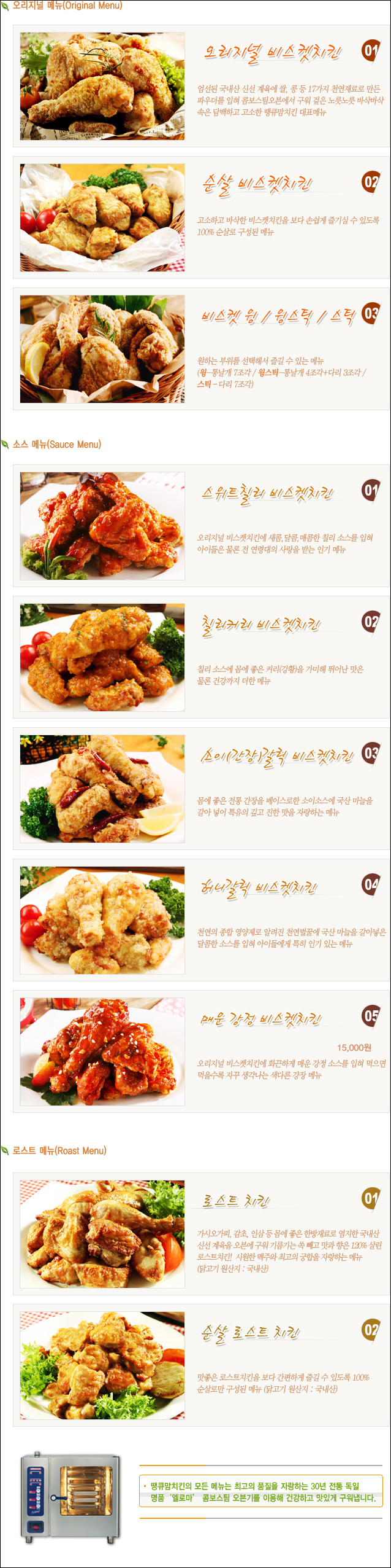비스켓파우더를 입혀 콤비스팀오븐에서 200℃ 이상 고온에서 구워낸 신개념 웰빙치킨으로