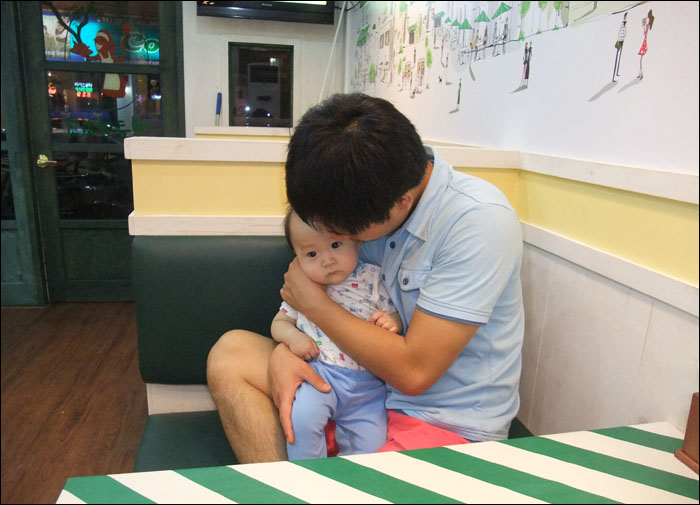 신랑이랑 울 아들이예요~ㅋㅋ 앉아서 테이크아웃을 위해 기다리고 있는 중...