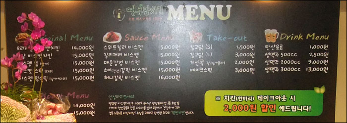 개인적인 바램으로 셋트메뉴가 생겼으면 좋겠다는 생각을 했어요~ 다른 치킨집엔 메뉴 종류별로 셋트 1,2~ 이렇게 되어있잖아요~