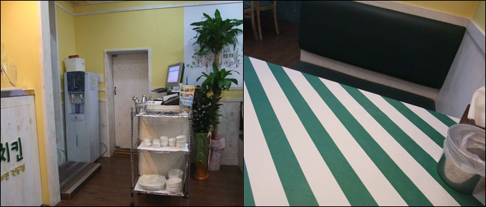 계산하는 곳에 접시도 가지런히 놓여져 있구, 식탁보는 깔끔한 사선 무늬 네요~!
