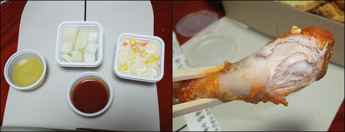 무도 그렇고 그옆에 샐러드도 그렇구요.. 전 먼저 닭다리 잡고 뜯기 바빴답니다..