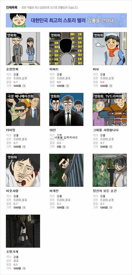 자신의 전 작품을 유료화 시범 모델로서 제공한 작가 역시 강풀이었습니다.