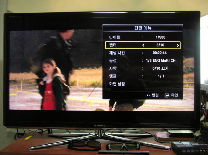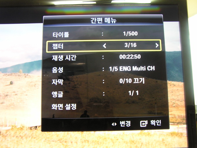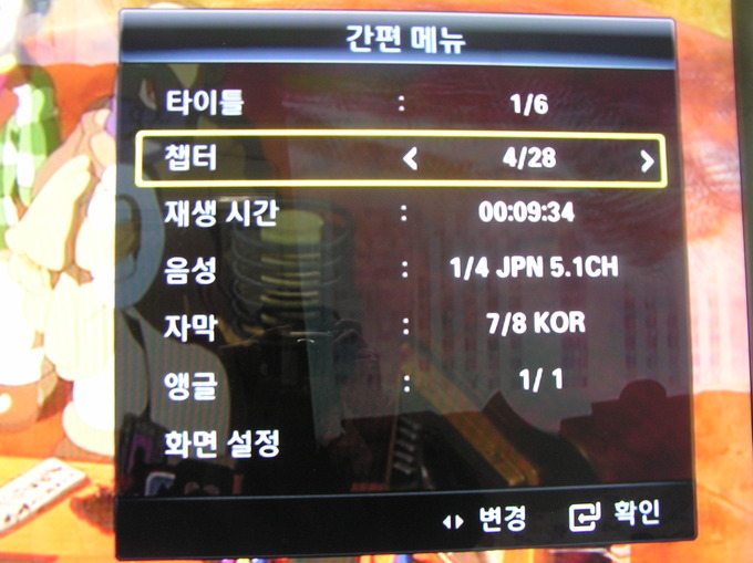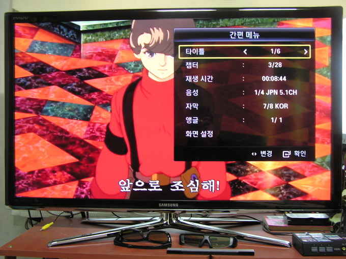 그리고 또 'BD-C6900' 에서만 제공되는 인터페이스인지 모르겠지만 영상을 보는 동안 '디스크 메뉴' 를 메인 메뉴로 돌아가지 않고, 영화 재생 화면에서 바로 '팝업' 으로 띄어 일괄적으로 설정을 변경할 수 있게 해주는 작업은 꽤나 흥미롭고 편리하더군요. 기존의 멀티미디어 플레이어는 무조건 메인 메뉴로 돌아가야 하는 번거로움이 당연시 됐었지만 블루레이 플레이어는 이런 것조차도 기본적으로 제공되는 서비스라고 생각하니 앞으로 발전할 블루레이 플레이어에 많은 기대를 하게 만듭니다. 그리고 'BD-C6900' 에서 제공되는 인터페이스로 영상 재생 화면에서 실시간으로 음성, 자막 변경이 볼륨 조작처럼 원터치 버튼으로 조작이 가능하더군요.