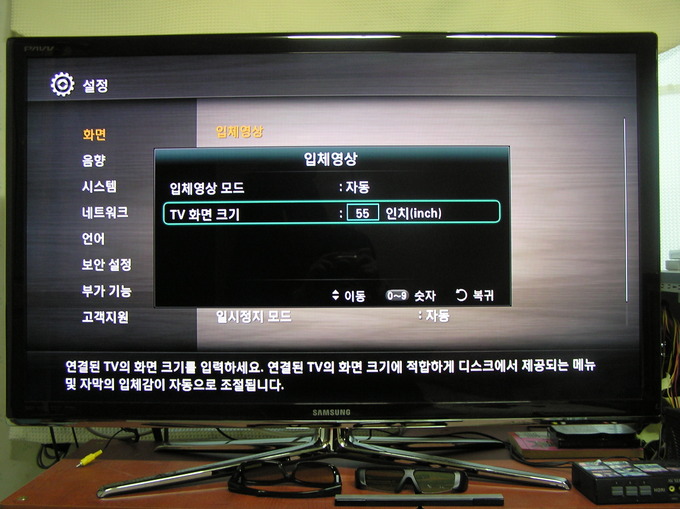 다음으로는 'BD-C6900' 가 블루레이 3D플레이어이기 때문에 3D입체화면에 대한 설정이 대단히 중요합니다. 단순히 3D입체화면 ON, OFF만 있으면 다가 아니라 연결해서 시청할 디스플레이의 화면 크기에 따른 원활한 입체감 제공을 위해서 따로 설정해 줘야 합니다. 이 모든 것들을 자동으로 해주는 것이 좋긴 하겠습니다만 자사의 디스플레이가 아닌 타사의 디스플레이일 경우 사용하는 규격이나 표준이 다를 가능성도 있고, PDP, LCD, LED, 브라운관 등에 따라 맞춰줘야 하는 것도 다를 것이기 때문에 화면 크기를 사용자가 직접 입력해 설정해주는 것이 좋을 듯 하더군요.