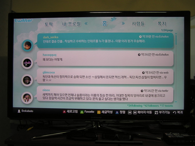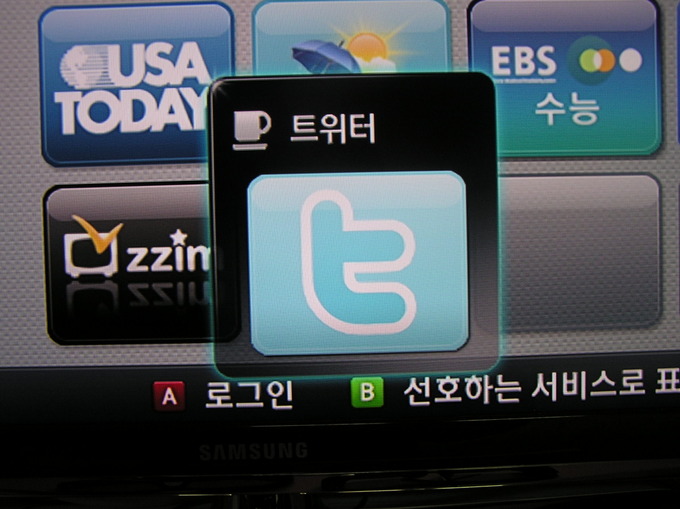 인터넷TV에는 재미있는 어플리케이션을 활용할 수 있는데 그중에서 가장 마음에 들었던 것이 바로 요즘 블로그 다음으로 많이 사용하고 있는 '트위터' 와 '유투브' 입니다. 트위터의 경우 PC는 물론 스마트폰에서 자주 사용하는 네트워크 커뮤니케이션 서비스로, TV를 보는 중간 간간히 트위터 어플리케이션을 구동해 친구들에게 방송에 관련된 정보를 트위팅할 수도 있고, 블루레이 3D플레이어이니 신작 블루레이 작품을 본 후 소감을 트위팅하는 것도 재미있을 듯 합니다.