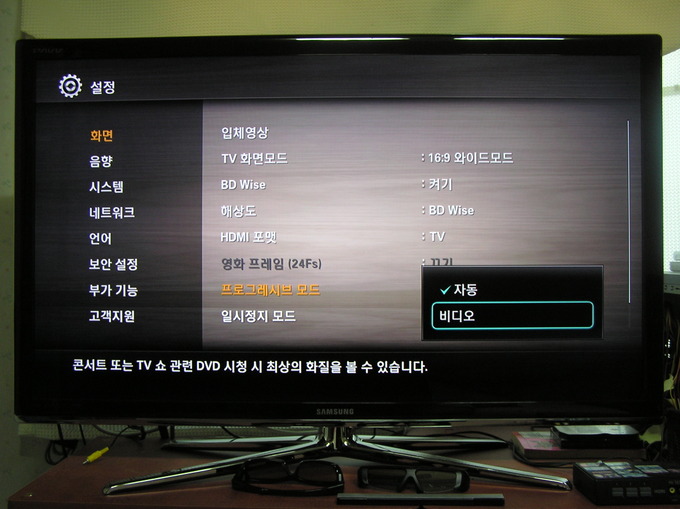 다음으로는 블루레이 3D플레이어이긴 합니다만 DVD도 재생하기 때문에 그에 따른 설정이 제공되고 있습니다. 위에서도 언급했다시피 DVD의 해상도는 640 X 480 이기 때문에 블루레이 플레이어를 연결하는 디스플레이의 화면 크기나 지원하는 해상도에 충족시키지 못할 가능성이 높습니다. 그런 부분들을 개발자들 역시 감안하고 있기 때문에 '프로그래시브 모드' 라는 것을 설정 속에 넣어둔 것이겠죠.